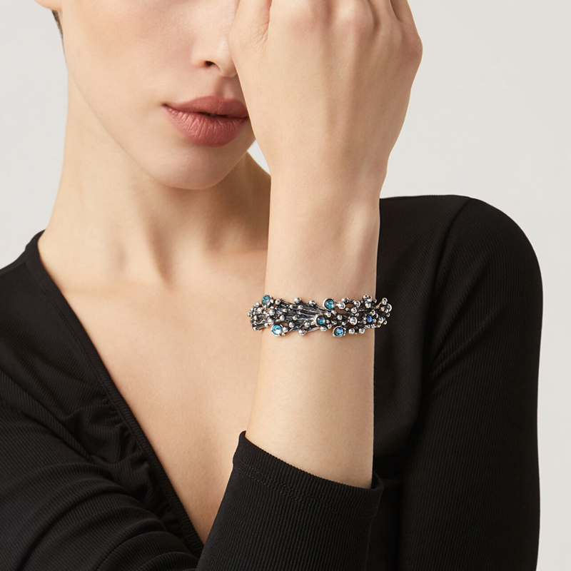 Questo bracciale viene realizzato in azienda, nel cuore della Toscana, con elementi modellati completamente a mano. Una vera e propria esplosione di luce e colore intorno al polso, grazie all’unione dell’argento brunito con i quarzi mystic ad effetto arcobaleno.