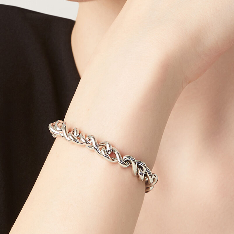Piccoli elementi in argento ritorto creano il motivo dell’Infinito, che posto in sequenza regala al gioiello dinamicità ed eleganza luminosa. Un bracciale leggero e contemporaneo, realizzato in house.