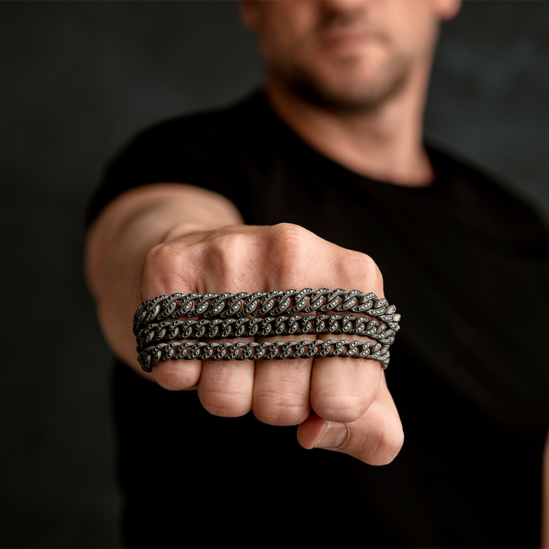Bracciale uomo linea groumette in titanio nero, diamanti black e oro rosso 18 kt, interamente realizzato a mano in titanio, dove una serie di maglie snodate costituiscono l’intera struttura di questo gioiello. Su ogni maglia sono incastonati due diamanti black da un punto e il bracciale termina con una pratica chiusura in titanio impreziosita da diamanti black e da un otto di sicurezza in oro rosso 18 kt.