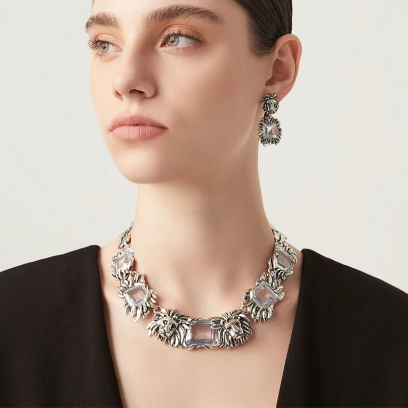 Di grande impatto emozionale, questa collana in argento brunito monta cinque grandi zirconi trasparenti. Il decoro richiama il tema del leone in stile déco, con la chioma dal ritmo forzato e il segno forte, quasi grafico.