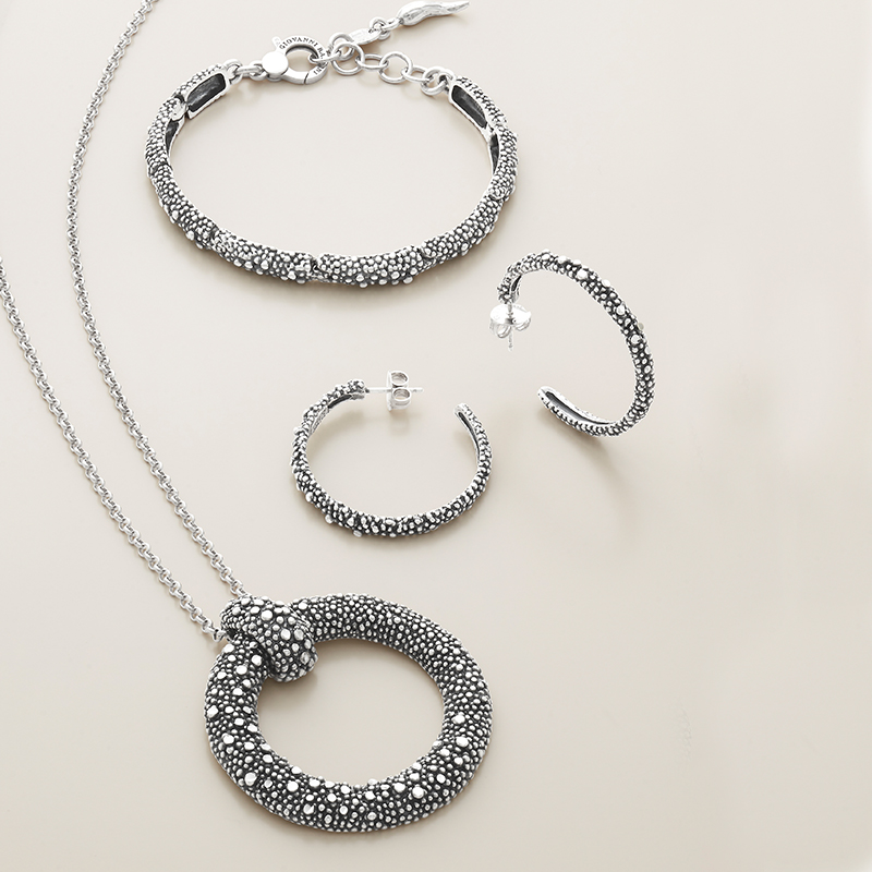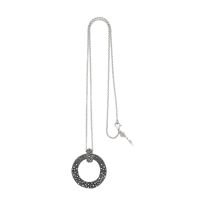 Il pendente Petit Perlage celebra il trionfo della fusione a cera persa. I sorprendenti effetti di chiaroscuro sono garantiti dalla diamantatura del pavé di sferette di argento brunito, caratterizzato da una elegante texture contemporanea.