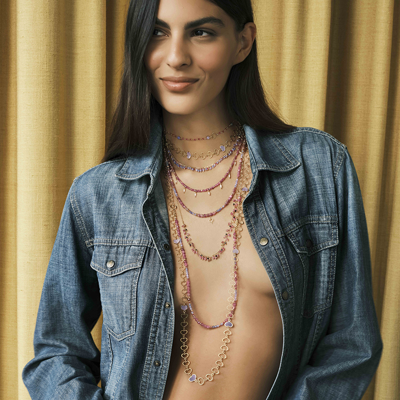 Presenta una serie di pietre di amazzonite, tanzanite, rubellite pendenti e cuore maman.