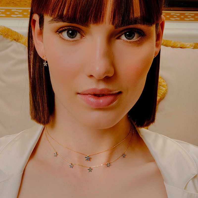Girocollo con fiore pendente in polvere di diamanti celeste realizzato in oro giallo 18 carati.
