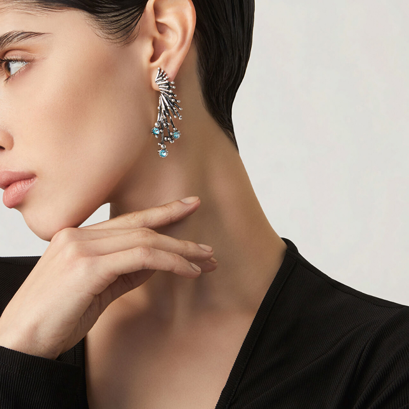 L’incontro dell’argento brunito con i quarzi mystic effetto arcobaleno rende questi orecchini una vera e propria esplosione di colore. Una cascata di luce che illumina immediatamente e incornicia il viso di chiunque li indossi. Realizzati in azienda con elementi modellati completamente a mano.