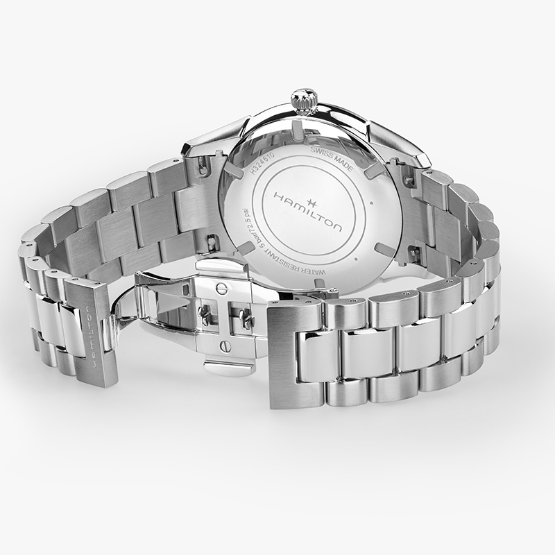 Elegante e versatile, il Jazzmaster Quartz 40 mm con quadrante nero esprime una raffinatezza senza tempo in una silhouette moderna. La cassa ultrasottile con finiture lucide e spazzolate incornicia il design minimalista, mentre le sfere scheletrate aggiungono un tocco contemporaneo. Una scelta classica per uno stile disinvolto.