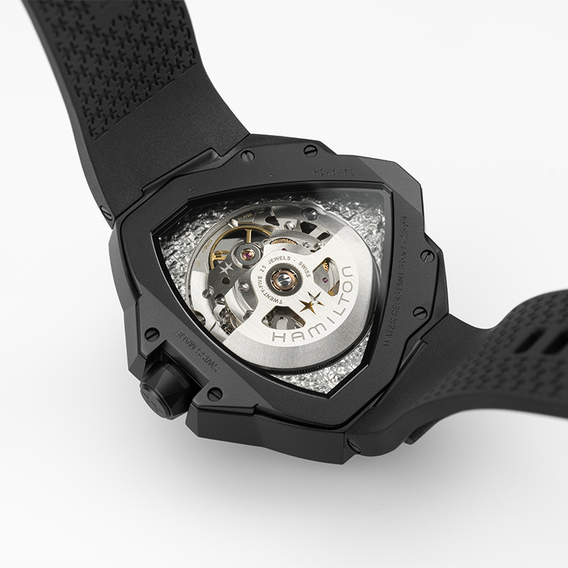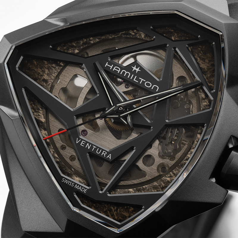 Il Ventura Edge Skeleton fa un audace passo nel futuro dell’orologeria. Distaccandosi dall’iconica struttura triangolare della cassa del Ventura, presenta un nuovo e audace design architettonico. Scuro, enigmatico e dal design radicale, questo segnatempo gioca con luci e ombre, aggiungendo una profondità quasi ultraterrena alla sua forma.